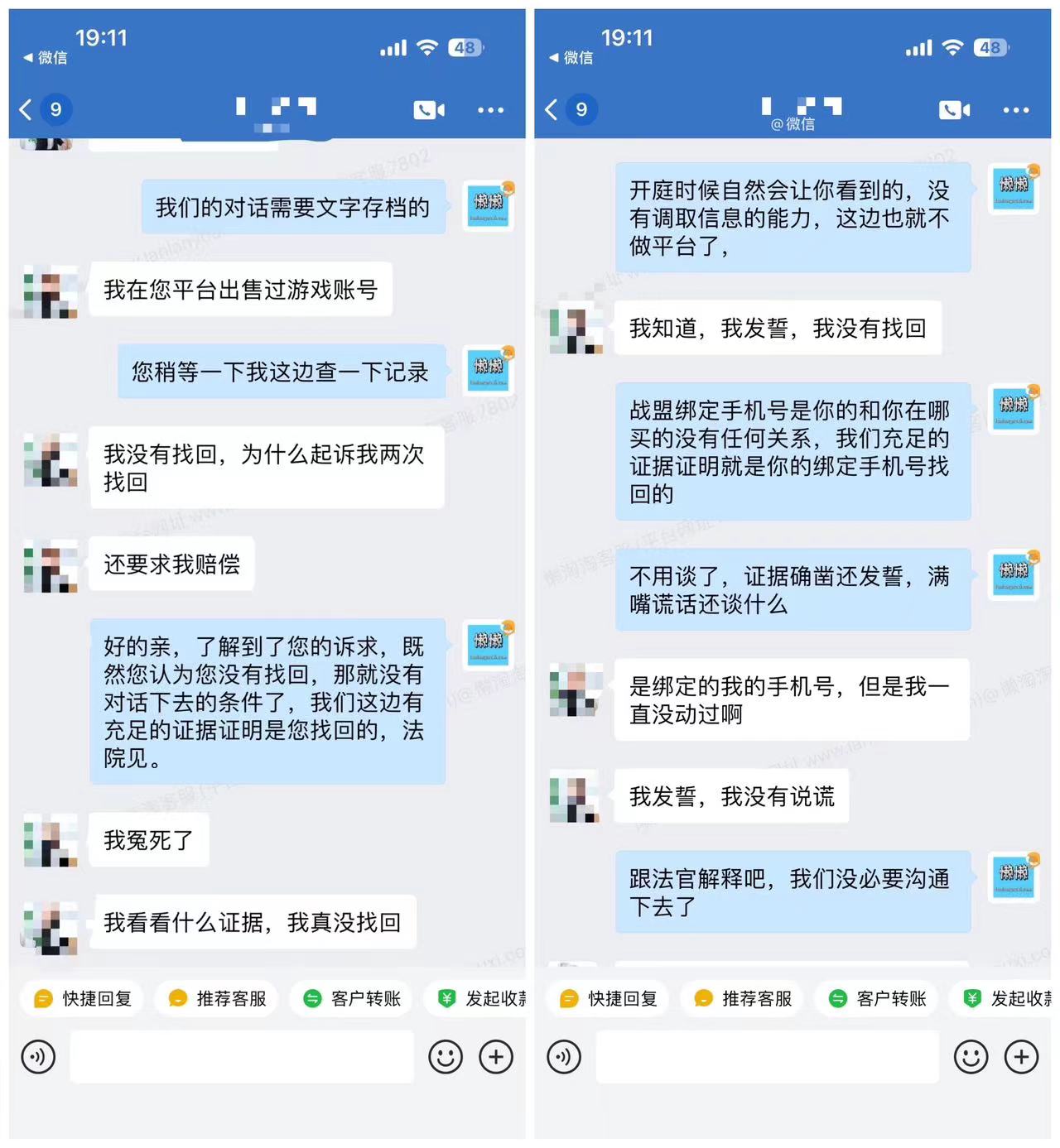 3月9日客户的一个跨平台转卖的价值1400元的账号被找回了经平台专员了解符合平台代理条件我们可以协助维权,经过添加找回人员将客服拉黑并且电话关机。