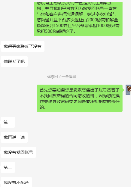 平台方考虑2000违约金过高,经调解买家同意将违约金降至1500元。平台法务与卖家沟通考虑卖家为误操作平台愿意帮忙承担1000元由卖家承担500即可经过多轮沟通(中途卖家也找了律师与平台法务沟通,在得知总违约金1500元并且平台方愿意帮忙承担1000元他只需承担500后表示不介入处理了)最后卖家对500元也不认可。