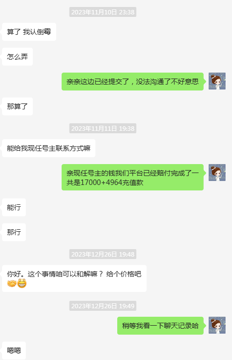 12月26日卖家再次找到客服进行庭外和解,经平台法务计算按照诉讼金额+合同标明的违约金卖家需赔偿平台21964元+6000元违约金,后经沟通卖家赔偿平台8000元违约金+账号归属平台达成庭外和解。
